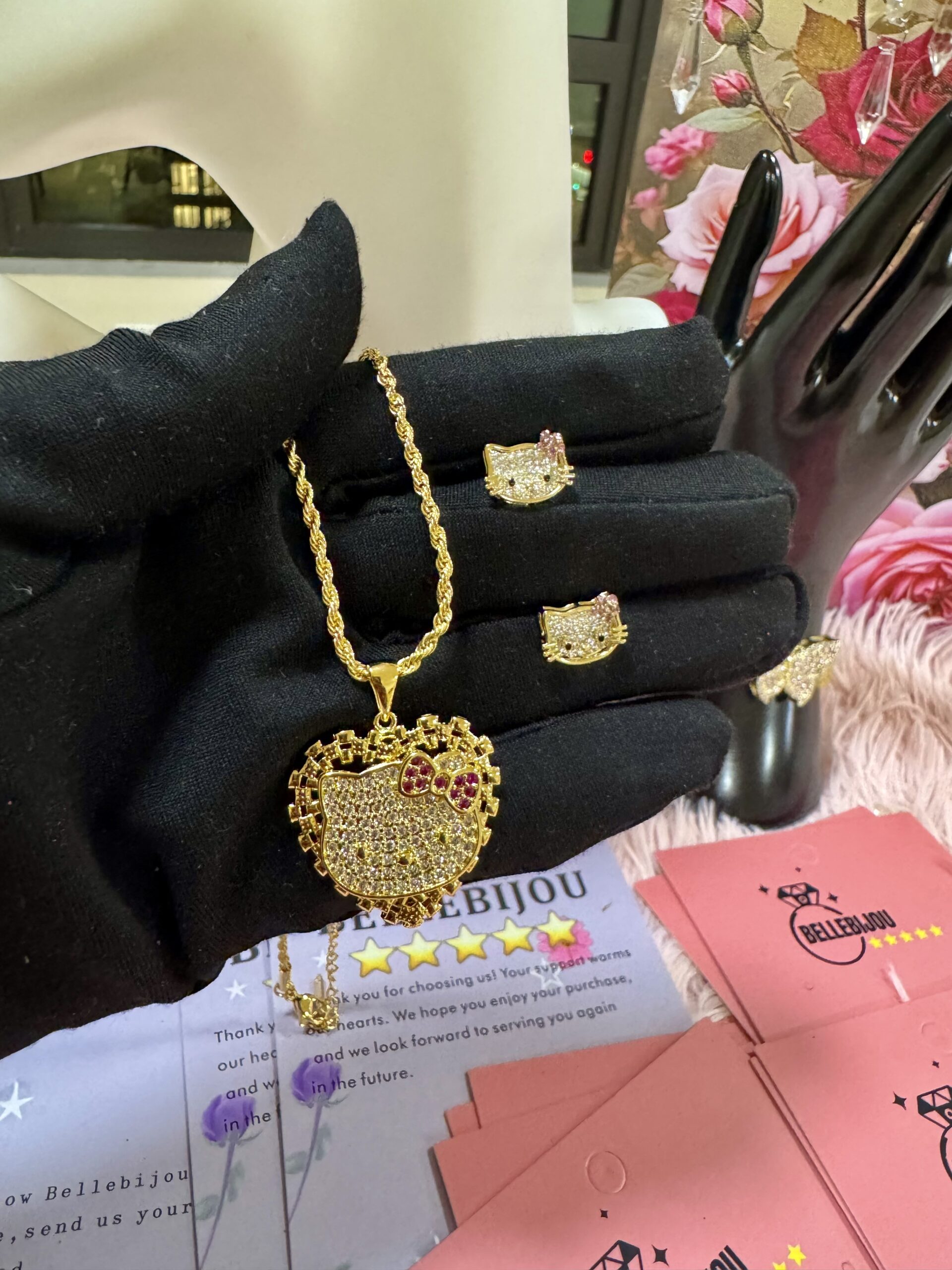 Hello Kitty Gold Tone Rhinestone Cat Charm Pendant Necklace Rope Chain + earrings